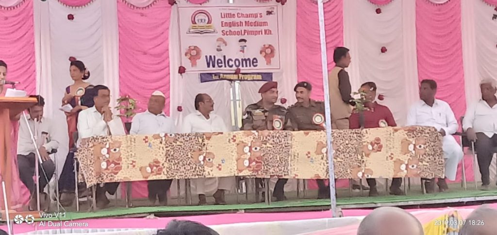 सांस्कृतिक कार्यक्रमात विद्यार्थ्यांचा जल्लोष दि.७ मार्च.पिंप्री खु।।. ता.धरणगांव येथिल लिटल चॅम्स इंग्लिश मेडीयम स्कुल प्री.प्रायमरीच्या विद्यार्थ्यांचा कार्यक्रम संपन्न झाला. कार्यक्रमास अध्यक्ष म्हणुन फैजपुर येथिल लेफ्टनंट प्रा. राजेद्र राजपुत तर प्रमुख पाहुणे म्हणुन भारतीय सैन्य दलात जम्मु येथे कार्यरत असलेले जितेंद्र चौधरी, जळगाव जिल्हा परिषद सदस्य गोपालजी चौधरी व इतर मान्यवरांच्या उपस्थित संपन्न झाला. “संदेशे आते है संदेशे जाते है” “बाॅर्डर” चित्रपटातील गाण्यावर लिटील चँपच्या अभिनयाने मान्यवर व प्रेक्षकांची मने जिंकली.