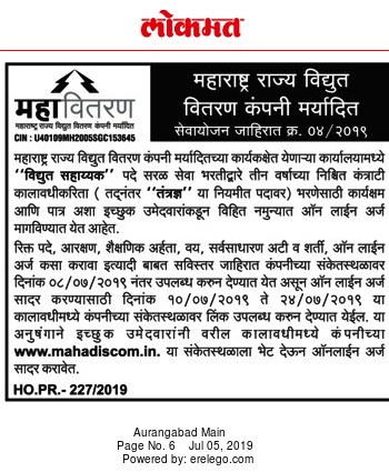 महाराष्ट्र राज्य विद्युत वितरण कंपनी मर्यादित मध्ये विद्युत सहाय्यक पदाची भरती July 6, 2019 Sandeep Kotwal नोकरी विषयक (Jobs) 0 Share this:WhatsApp