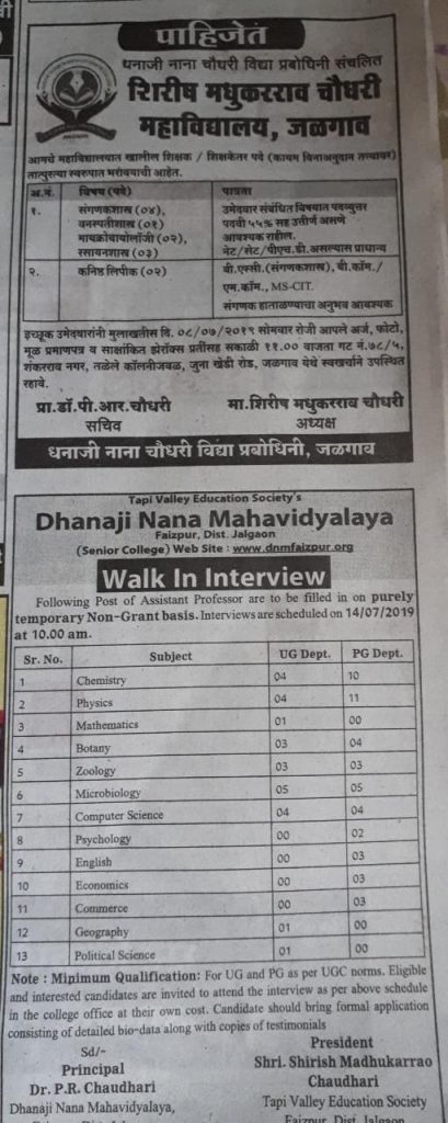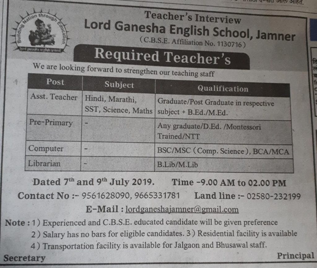 Vacancy / Walk-in for Teacher, Jalgaon/Jamner July 6, 2019 Sandeep Kotwal नोकरी विषयक (Jobs) 0 Share this:WhatsApp