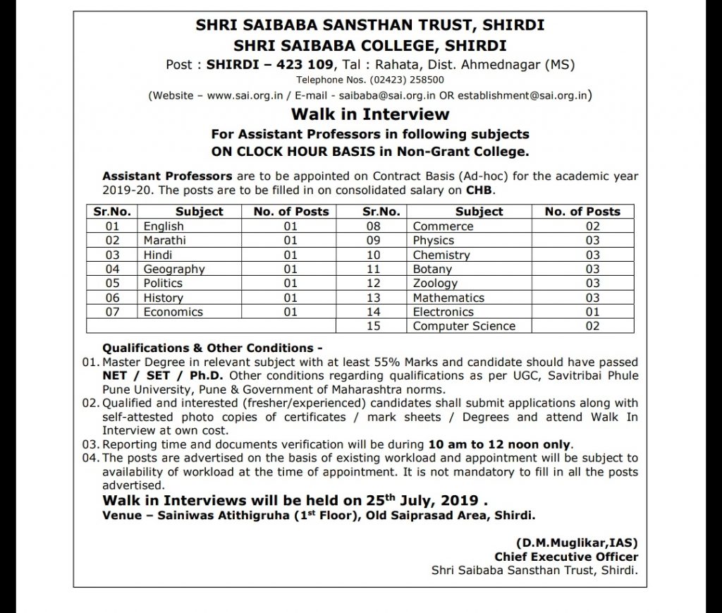 Interested candidates having PG with 55% & NET/SET or Ph.D. may appear for interview on 25th July 2019 @ Sai Niwas Guest House, Shirdi for