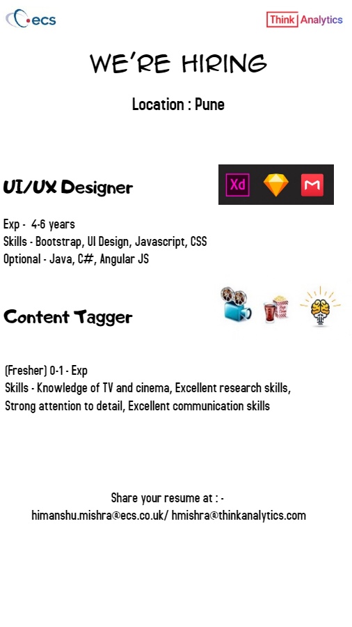 UI/UX designer and Content Tagger opening in Pune October 9, 2019 Manish Badgujar आय-टी जॉब्स (IT Jobs) 0 Share this:WhatsApp EngineerInterviewjobs