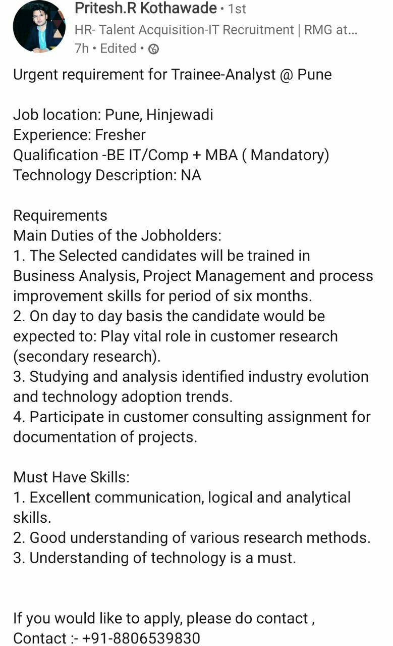Job: Urgent requirement for Trainee Analyst @Pune December 5, 2019 Manish Badgujar नोकरी विषयक (Jobs) 0 Share this:WhatsApp