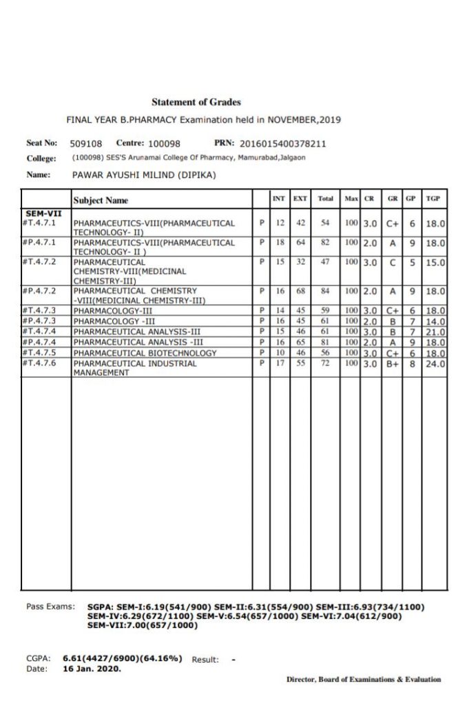 कु.आयुष्य मिलिंद पवार ही चोपडा येथील वसंत केशवराव धारपवार यांची नात असून, मिलिंद वसंत धारपवार यांची कन्या आहे. कु.आयुषी ने फायनल इअर बी फार्म सी मध्ये 6.61गुण मिळवून यश संपादन केले आहे.