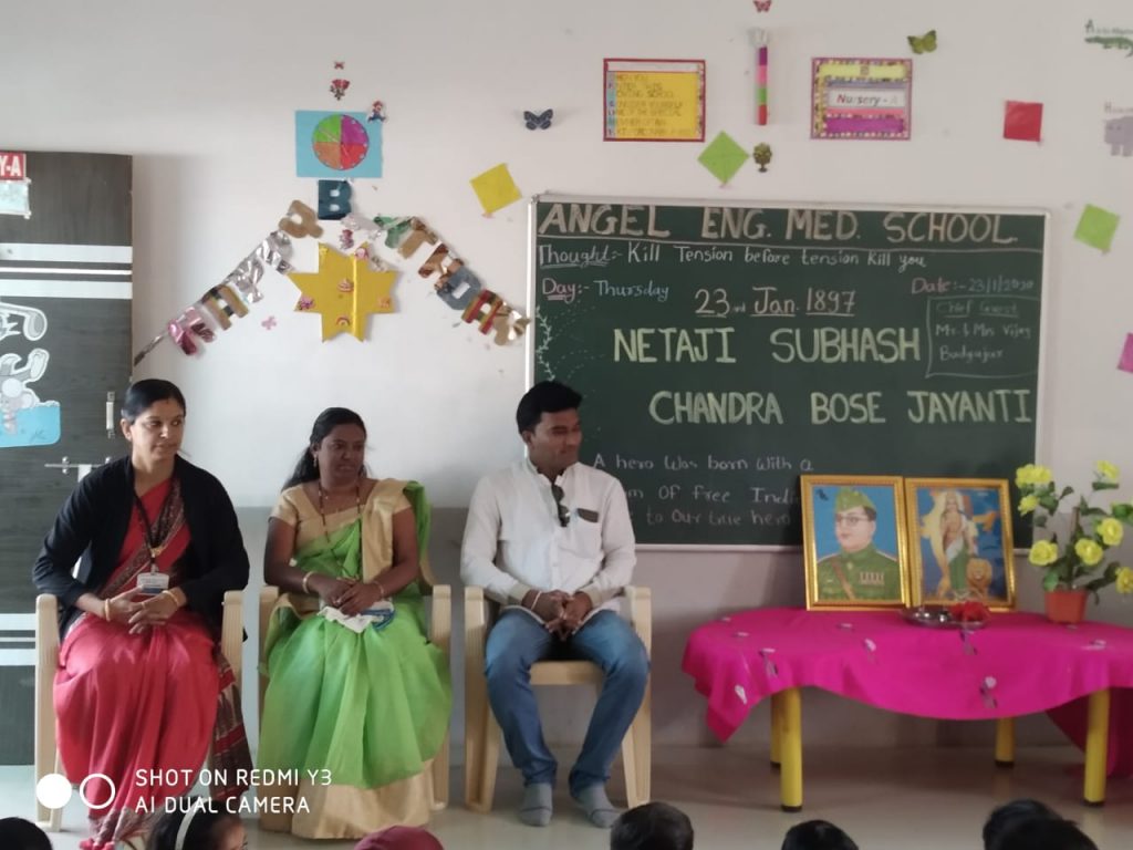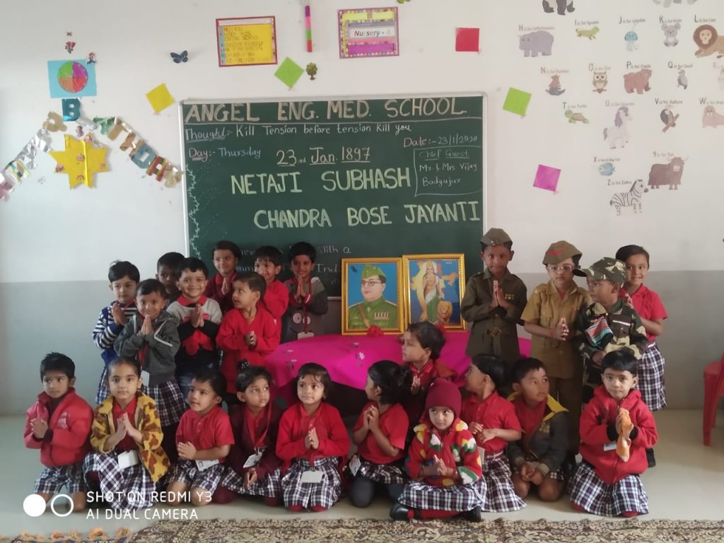 नंदुरबार : दि .23/1/2020 गुरुवार रोजी ‘एंजल इंग्लिश स्कुल’ मध्ये तसेच ह्या शाळेची दुसरी शाखा कल्याणी रेसीडेंसी येथे नेताजी सुभाषचंद्र बोस यांची जयंती साजरी करण्यात आली. कार्यक्रमाचे अध्यक्षस्थान नंदुरबार बडगुजर समाजाचे अध्यक्ष श्री.विजय बडगुजर ह्यांनी भुषविले. शाळेतल्या चिमुकल्यानी नेताजी सुभाषचंद्र बोस यांची वेशभूषा केली होती. त्यामुळे नेताजींचा इतिहास तसेच त्यांचे कार्य या चिमुकल्यानी डोळ्यासमोर आणले.