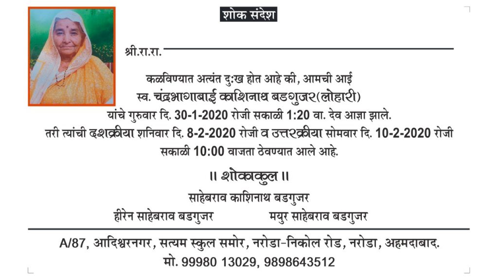अहमदाबाद येथील श्री. साहेबराव काशीनाथ बडगुजर यांची आई नामें गं.भा.चंद्रभाबाई काशीनाथ बडगुजर यांचे निधन ३०/१/२०२० वार गुरुवार १.२० मि. दुखद निधन झाले. तरी त्यांची अंत्ययात्रा ३०/१/२०२० रोजी सकाळी ११.०० वाजता राहत्या घरुन – ए/८७ आदिश्वरनगर, नरोडा, अहमदाबाद येथून निघणार आहे. त्यांचे आत्म्यांस परमेश्वर चिर शांती देवो ही परमेश्वरी चरणी प्रार्थना!
