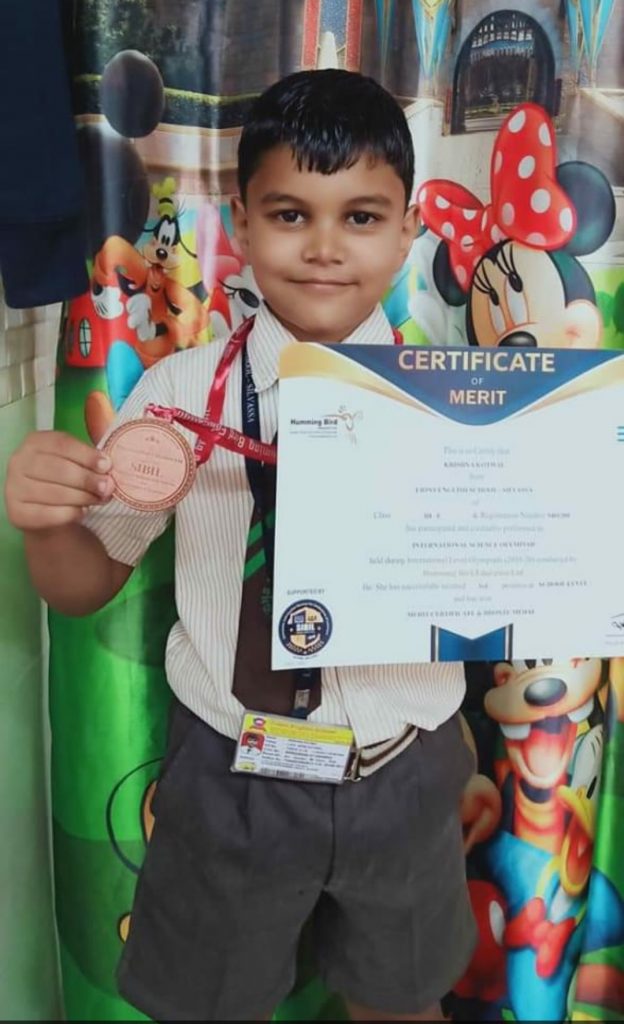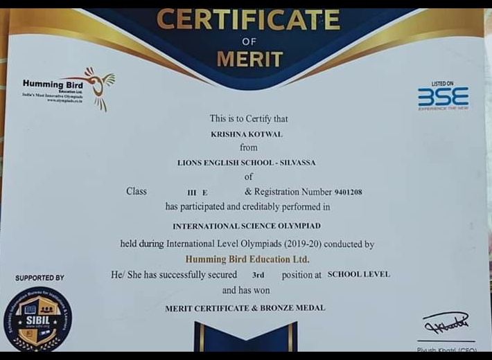 Humming Bird एज्युकेशन तर्फे आयोजित इंटरनेशल लेव्हल ऑलपियाड स्पर्धेत चि. क्रिष्णा बिपिन कोतवाल ला ब्रॉन्झ मेडल – डॉ. चंद्रशेखर बडगुजर, सिलवासा
