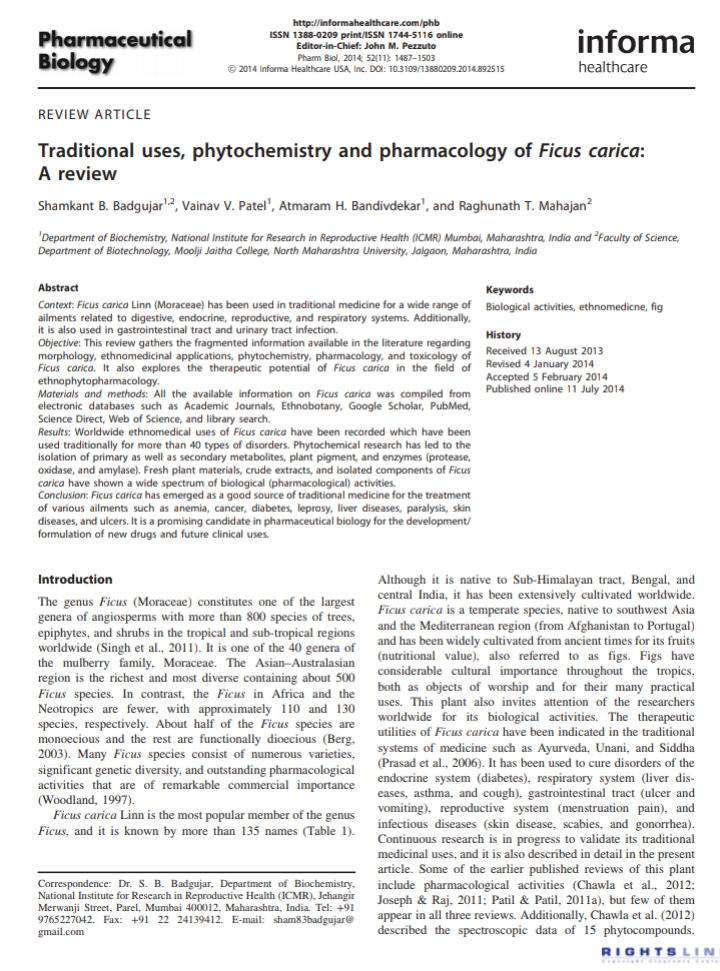 S.B. Badgujar, V.V. Patel, A.H. Bandivdekar, and R.T. Mahajan, “Traditional uses, phytochemistry and pharmacology of Ficus carica: A review”