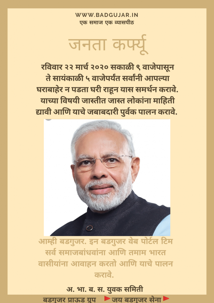 मा, नरेंद्रजी मोदी यांनी आपल्या संपूर्ण भारत वासीयांना आज आवाहन केले आहे की, दि 22 मार्च 2020 रोज रविवार वेळ सकाळी 7 ते रात्री 9 वाजेपर्यंत आपण जनता कर्फ्यु चे पालन करायचे आहे, यात कुणीही आपल्या घराबाहेर पडू नये, आपल्या घरातच राहून आपण माननीय प्रधानमंत्री श्री,नरेंद्र मोदी जी यांच्या आवाहनाला साथ द्यायची आहे, आणि इतरांनाही याविषयी सांगायचे आहे, कारण कोरोना सारख्या रोगावर नियंत्रण आणण्यास यामुळे मदत होईल, वेब पोर्टल टिम याचे जबाबदारी पुर्ण पालन करेल, आम्ही आशा करतो की आपणही नरेंद्र जी मोदी यांच्या आवाहनास साथ द्याल, आम्ही देखील यात सहभागी होत आहे. आपणही व्हावे.