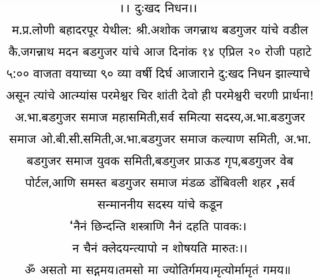 दुःखद निधन : म. प्र. लोणी बहादरपुर येथील कै. जगन्नाथ मदन बडगुजर यांचे दुःखद निधन April 14, 2020 Lokesh दुःखद वार्ता (Sad News) 0 Share this:WhatsApp