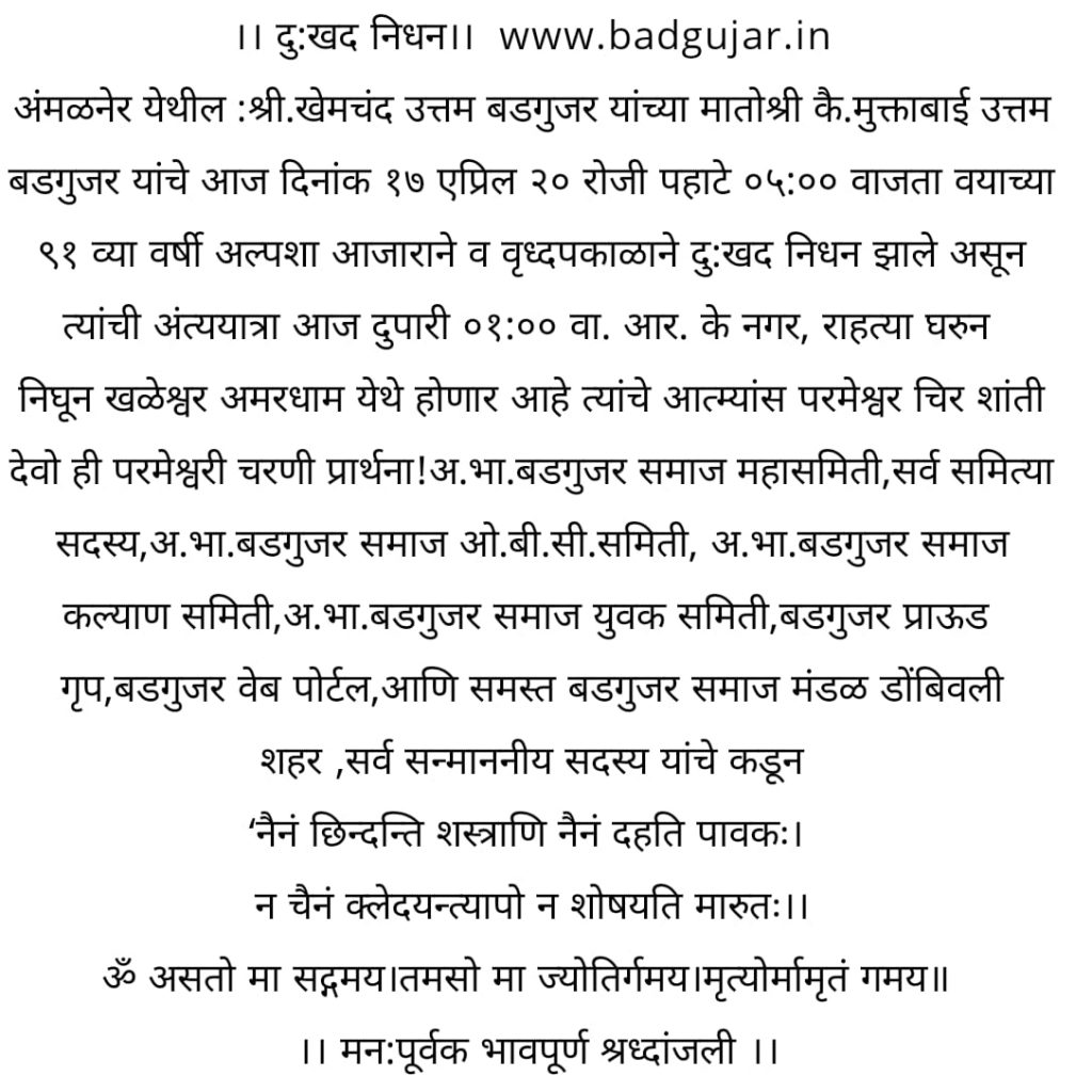 अमळनेर येथील कै. मुक्ताबाई उत्तम बडगुजर यांचे दुःखद निधन April 17, 2020 Lokesh दुःखद वार्ता (Sad News) 0 Share this:WhatsApp
