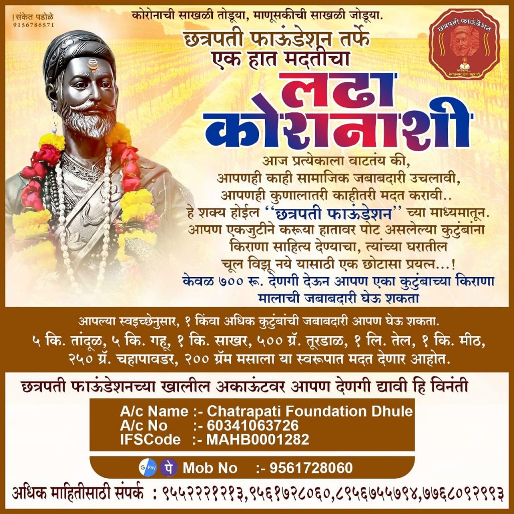 धुळ्यातील गोरगरीब तसेच गरजू व्यक्तींना मदत कार्यात नेहमी अग्रेसर असणारी छत्रपती फाऊंडेशन संस्था ही कोरोना विरुद्धच्या लढाईत सुद्धा मदती साठी पुढे आली आहे. आज प्रत्येकाला वाटत की आपणही काही सामाजिक जबाबदारी उचलावी, आपणही कुणालातरी काहीतरी मदत करावी. या सामाजिक जबाबदारीचे भान ठेवून हातावर पोट असणाऱ्या कुटुंबांना मदतीचा हात म्हणुन किराणा साहित्य देण्याचा, त्यांच्या घरातील चूल विझू नये. यासाठी एक छोटासा प्रयत्न छत्रपती फाऊंडेशन धुळे यांच्या वतीने करण्यात येत आहे.