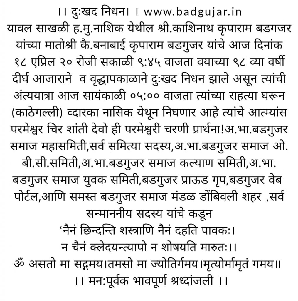 यावल साकळी ह. मु. नाशिक येथील कै. बनाबाई कृपाराम बडगुजर यांचे दुःखद निधन April 18, 2020 Lokesh दुःखद वार्ता (Sad News) 0 Share this:WhatsApp