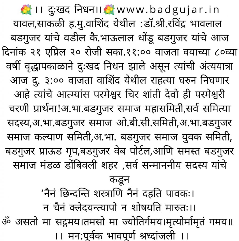 यावल, साकळी ह. मु. वाशिंद येथील कै. भाऊलाल धोंडू बडगुजर यांचे दुःखद निधन April 21, 2020 Lokesh दुःखद वार्ता (Sad News) 0 Share this:WhatsApp