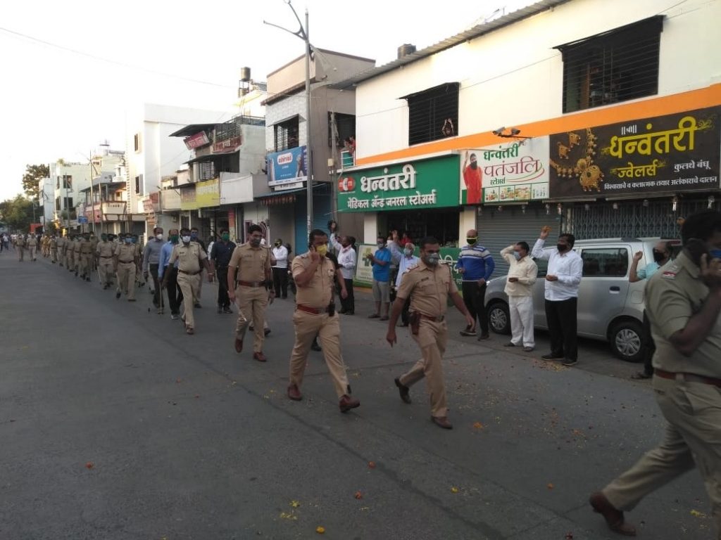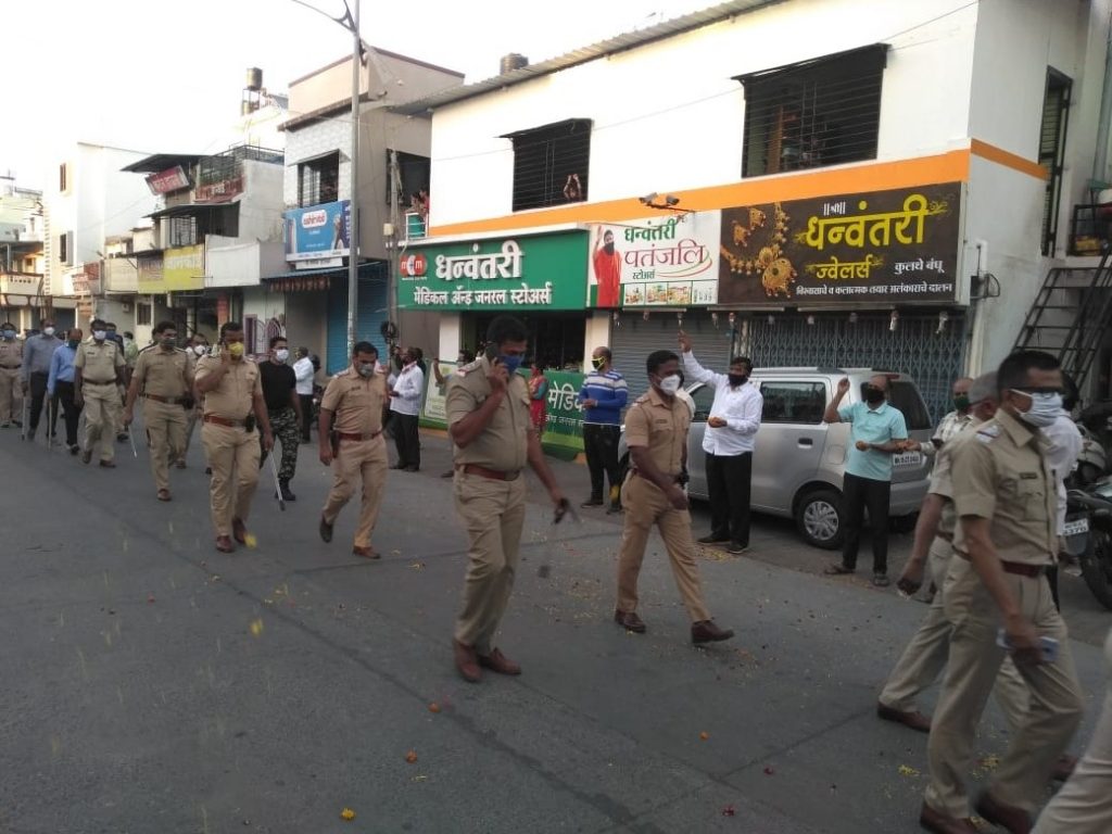 नवीन नाशिक : कोरोना विषाणुचा प्रादूर्भाव रोखण्यासाठी गेल्या काही दिवसांपासून सातत्याने उपाय योजना केल्या जात आहेत. नागरीकांना वारंवार सूचनाही देण्यात येत आहेत. कोरोनाच्या रुग्णांची संख्या दिवसेंदिवस वाढत चालली आहे. सर्वांनीच काळजी घेण्याची गरज आहे. यातून पोलिस दलाच्या वतीने मंगळवारी सायंकाळी नवीन नाशिक परिसरातून पोलिस वाहना सह पथ संचलन केले या प्रसंगी प्रभाग क्र.२५ चे नगरसेवक व माजी विरोधी पक्षनेते नेते श्री. सुधाकर भाऊ बडगुजर व माजी प्रभाग सभापती सौ. हर्षाताई बडगुजर व परिसरातील नागरिकांनी पुष्पवृष्टी करून व टाळ्या वाजवून पोलीस दलाचे स्वागत केले. लाॅकडाउन च्या काळात पोलिसांनी अहोरात्र चांगली सेवा दिली त्यांचे मनोधैर्य वाढवण्यासाठी संचलनातील वरिष्ठ पोलीस अधिकाऱ्यांसह अंबड पोलिस ठाण्याचे वरिष्ठ पोलीस निरीक्षक कुमार चौधरी, पोलीस उपनिरीक्षक कमलाकर जाधव नेतृत्वाखाली निघालेल्या संचलनामध्ये अंबड पोलिस ठाण्याचे अधिकारी, कर्मचारी, चार्ली पथक, वाहन पथक सहभागी झाले होते.