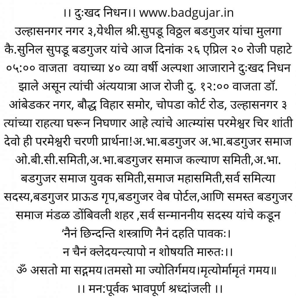 उल्हासनगर ३, येथील कै. सुनिल सुपडू बडगुजर यांचे दुःखद निधन April 26, 2020 Manish Badgujar दुःखद वार्ता (Sad News) 0 Share this:WhatsApp