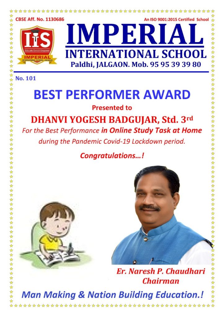 पाळधी येथील इम्पेरिअल इंटरनॅशनल स्कूल ची 3 ऱ्या इयत्तेतील विद्यार्थिनी कु. धन्वी योगेश बडगुजर हि पिंप्री खु, ता. धरणगांव येथील समाज बांधव दयाराम जगन्नाथ मोहकर यांची नात व योगेश दयाराम बडगुजर (प्रा.शिक्षक) जि. प. प्राथमिक शाळा तळई तालुका- एरंडोल यांची कन्या आहे. कोरोनामुळे सर्वत्रच सुट्टी असल्याने Imperial International School Paldhi, Jalgaon स्कूलतर्फे ONLINE STUDY TASK AT HOME स्पर्धा घेण्यात आली होती. यात कु.धन्वी हिस BEST PERFORMAR AWARD मिळाला या यशा बद्द्ल तिचे सर्वत्र कौतुक होत आहे.