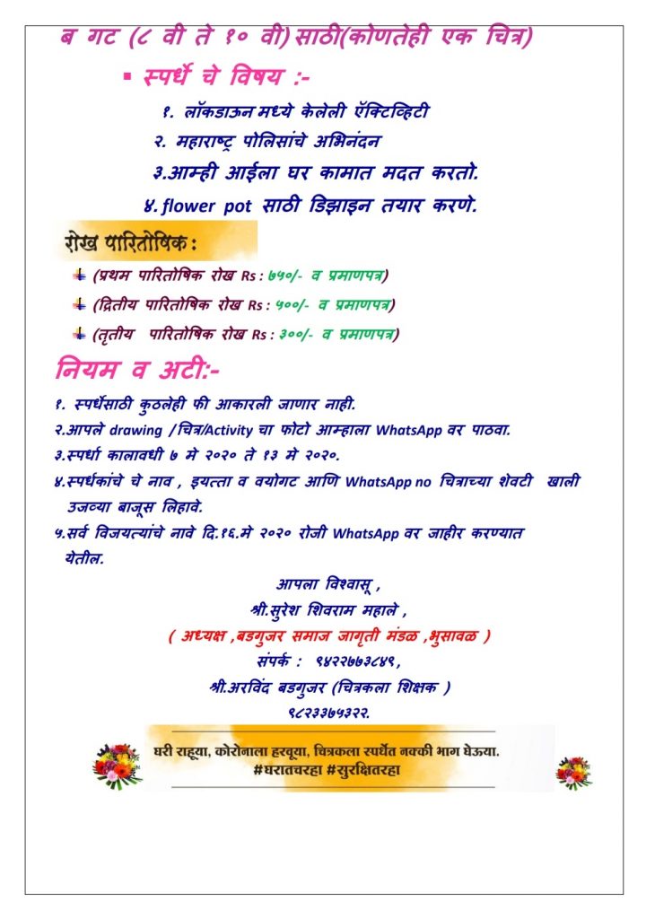 सर्व भुसावळ येथील समाजबांधवांना कळविण्यात येत आहे की, आपण कोविड 19 लॉकडाऊन कालावधीत आपल्या पाल्यांसाठी चित्रकला स्पर्धेचे आयोजन करीत आहोत, तरी समाजबांधवांनी आपला पाल्य कोणत्या गटात बसतो ते पाहून अवश्य आपल्या पाल्यास सहभागी करावे हि विनंती मंडळातर्फे आवाहन करण्यात येत आहे. सदर कार्यक्रम विषयी अटी व नियम खाली दिलेल्या माहिती पत्रकात आहे. सर्वांनी या स्पर्धेत सहभाग घ्यावा. सदरील स्पर्धा फक्त भुसावळ शहरासाठी घेण्यात येणार आहे.