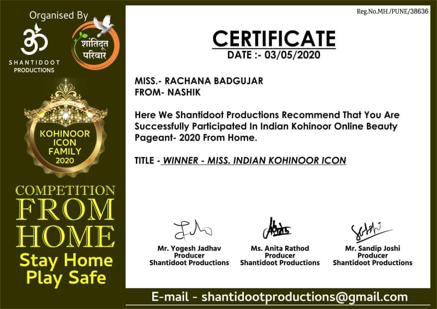 शांतिदूत प्रोडक्शन तर्फे दि. 3 मे 2020 रोजी MISS. INDIA KOHINOOR ICON-2020 ऑनलाईन ब्युटी स्पर्धा आयोजित करण्यात आली होती. यात (Disabled Category) हा गट ही होता व या स्पर्धा मध्ये नाशिक येथील कु. रचना सुधाकर बडगुजर यांनी (Disabled Category) मधून या स्पर्धेत सहभाग घेतला.