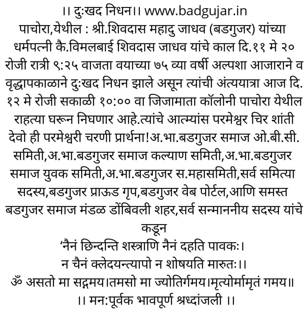 पाचोरा येथील कै. विमलबाई शिवदास जाधव यांचे दुःखद निधन May 12, 2020 Lokesh दुःखद वार्ता (Sad News) 0 Share this:WhatsApp