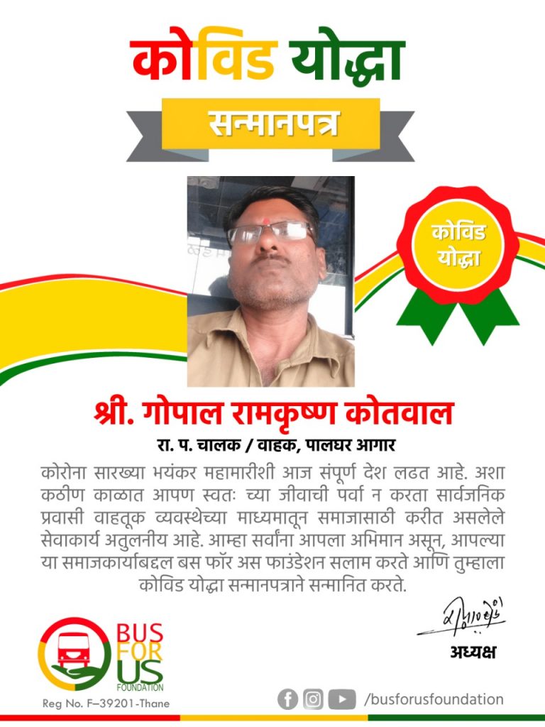 मुळगांव कुर्हे पानाचे ह. मु. पालघर येथील श्री. गोपाल रामकृष्ण कोतवाल, रा. प. चालक/वाहक, पालघर आगार यांना BUS FOR US FOUNDATION तर्फे कोविड योध्दा सन्मान पत्र देण्यात आले.