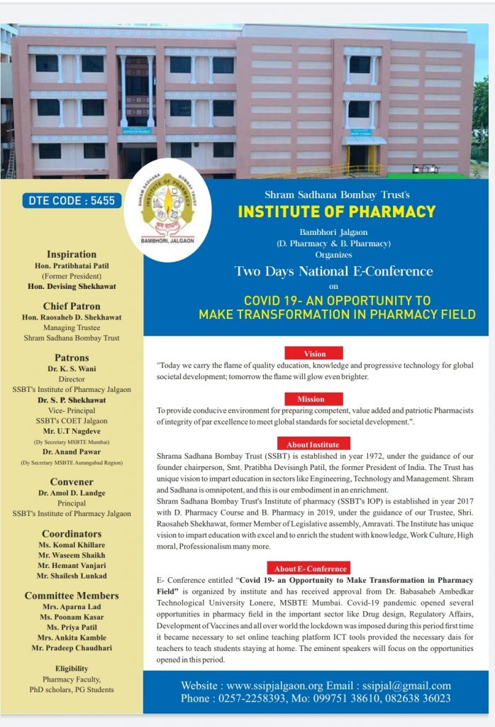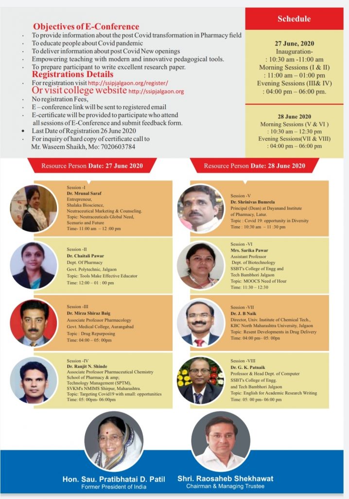 एसएसबीटी इन्स्टिट्यूट ऑफ फार्मसी मुंबई यांचेमार्फत दोन दिवसीय राष्ट्रीय स्तरावरचे ई- कॉन्फरन्स चे आयोजन करण्यात आले होते.covid-19 हि फार्मसी क्षेत्रांत बदल घडवून आणण्यासाठी असलेली एक सुवर्णसंधी हा या कॉन्फरन्स चा विषय होता. दिनांक 27 व 28 जून 2020 या दोन दिवसात सदर ई-कॉन्फरन्सचे आयोजन करण्यात आलेले होते. त्यात लातूर मुंबई औरंगाबाद शिरपूर अशा अनेक शहरांमधून केवळ आठ व्यक्तींची रिसोर्स पर्सन किंवा मार्गदर्शक प्राध्यापक म्हणून नियुक्ती करण्यात आली होती. या आठ व्यक्तींमध्ये बडगुजर समाजातील एस एस बी टी इंजीनियरिंग अँड तंत्रज्ञान महाविद्यालय बांभोरी येथे कार्यरत असलेल्या बायोटेक्नॉलॉजी डिपार्टमेंटच्या सहाय्यक प्राध्यापिका सौ सारिका पवार यांची सुद्धा निवड राष्ट्रीय स्तरावरच्या कॉन्फरन्स मध्ये मार्गदर्शक म्हणून करण्यात आली होती. ही बाब बडगुजर समाजासाठी अभिमानाची अशी ठरली आहे.