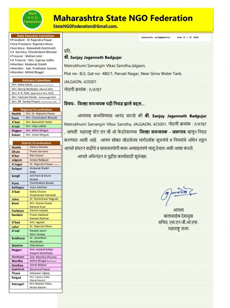 आपण गेल्या वीस वर्षा पासून ही समाजसेवा करत आहात त्याचे फलित म्हणून आपल्याला महाराष्ट्र स्टेट एनजीओ फेडरेशनने जळगांव जिल्ह्या साठी जिल्हा समन्वयक म्हणून निवड केली आहे. अ.भा.बडगुजर समाज ओ.बी.सी. समिती, अ.भा.बडगुजर समाज युवक समिती, बडगुजर प्राऊड गृप, बडगुजर वेब पोर्टल यांचे कडून आपले खूप खूप मन:पूर्वक अभिनंदन!