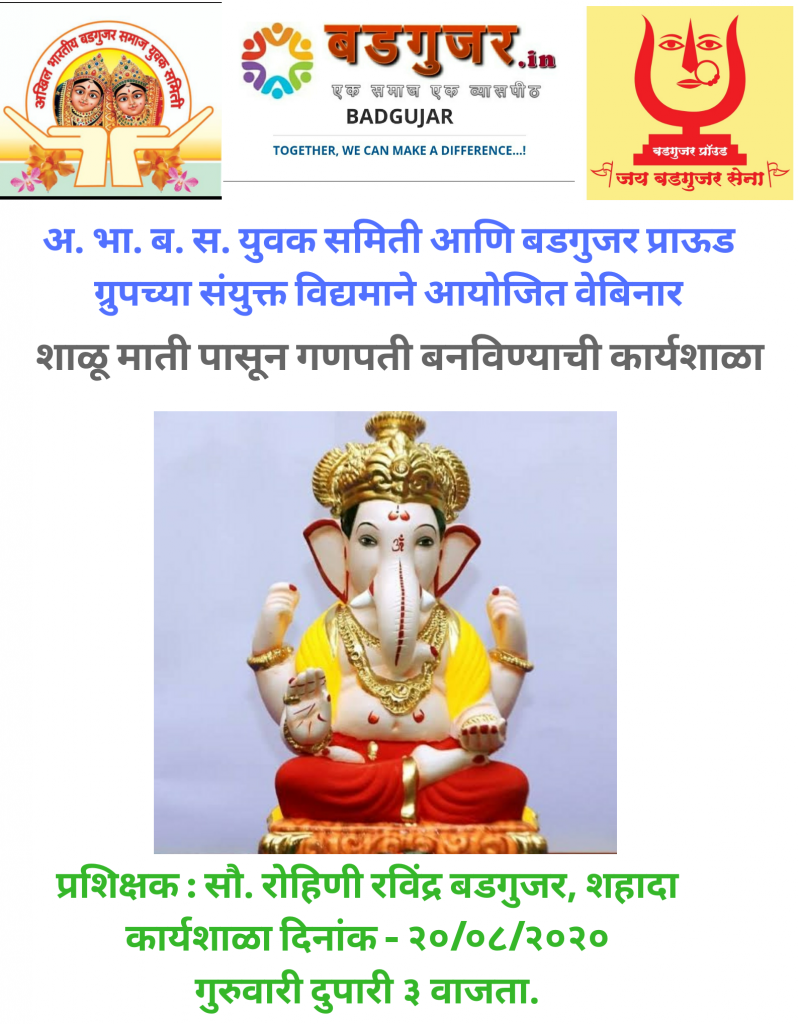 सध्या बाजारातील गणपती मूर्ती पेक्षा पर्यावरणपूरक तसेच स्वतः तयार केलेल्या मूर्तींकडे कल वाढत जात आहे. यासाठी खास बडगुजर समाजातील महिलां व मुलांसाठी अखिल भारतीय बडगुजर समाज युवक समिती व बडगुजर प्राऊड ग्रुप यांच्या संयुक्त विद्यमाने घरी बसल्या मोफत गणपती मूर्ती बनवण्याचे प्रशिक्षण/ वेबिनार घेण्यात येणार आहे. चला तर मग या वर्षी आपण स्वतः तयार केलेल्या गणपती ची स्थापना करूया…..
