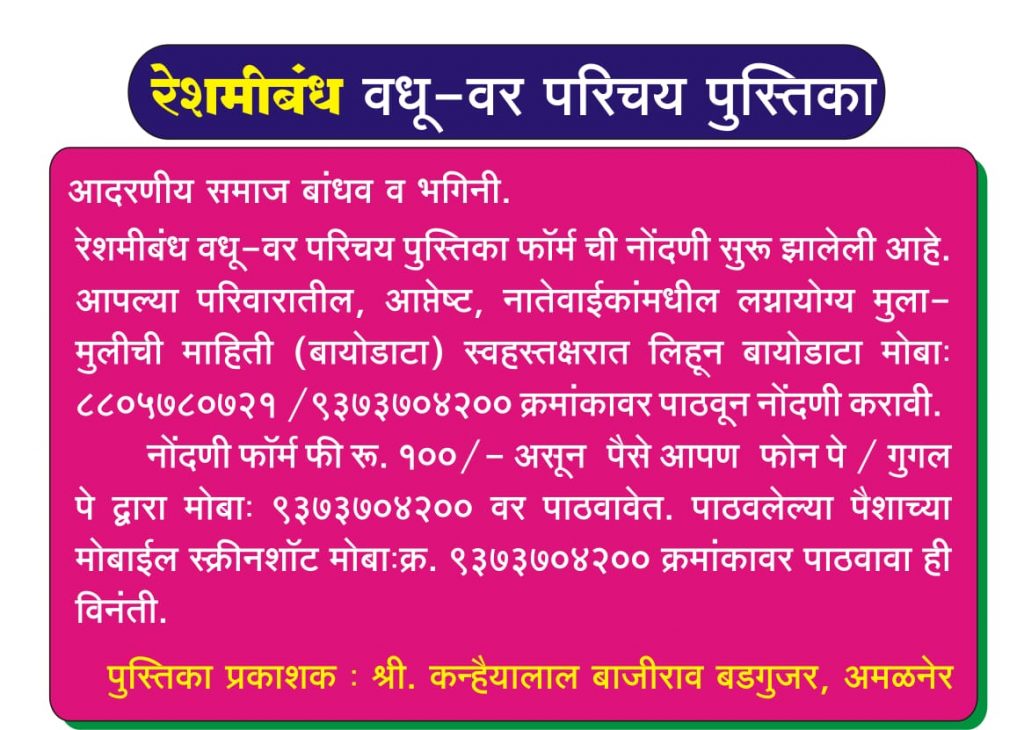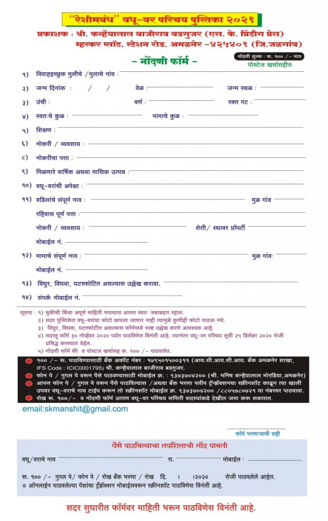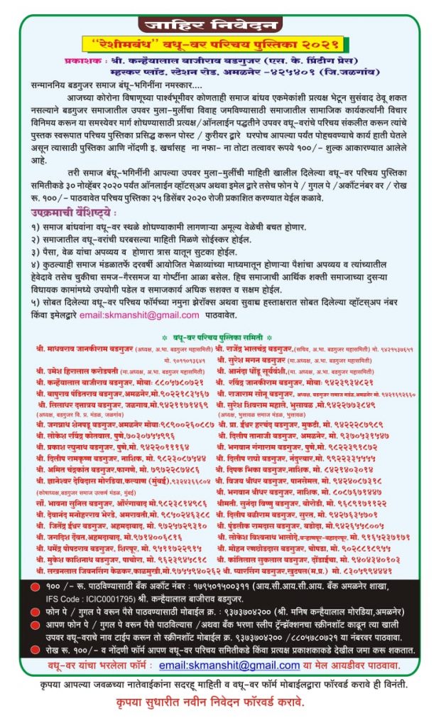 तसेच काही अडचण येत असल्यास वधुवर परिचय पुस्तक समितीतील सदस्यांना संपर्क साधावा. धन्यवाद