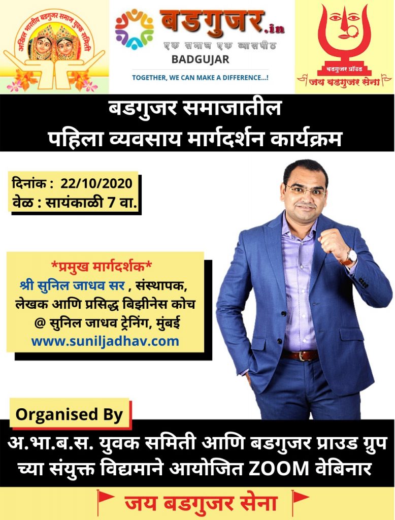 दिनांक 22 ऑक्टोबर 2020 रोजी संध्याकाळी सात वाजता अखिल भारतीय बडगुजर समाज युवक समिती व बडगुजर प्राऊड ग्रुप यांच्या संयुक्त विद्यमाने तसेच बडगुजर बिझनेस फोरम ग्रुपच्या सहकार्याने आयोजित बडगुजर समाजातील पहिला व्यवसाय मार्गदर्शन पर कार्यक्रम श्री. सुनील जाधव सर बिजनेस कोच ,लेखक आणि मोटिवेशनल स्पीकर व संस्थापक, सुनिल जाधव ट्रेनिंग , मुंबई www.suniljadhav.com