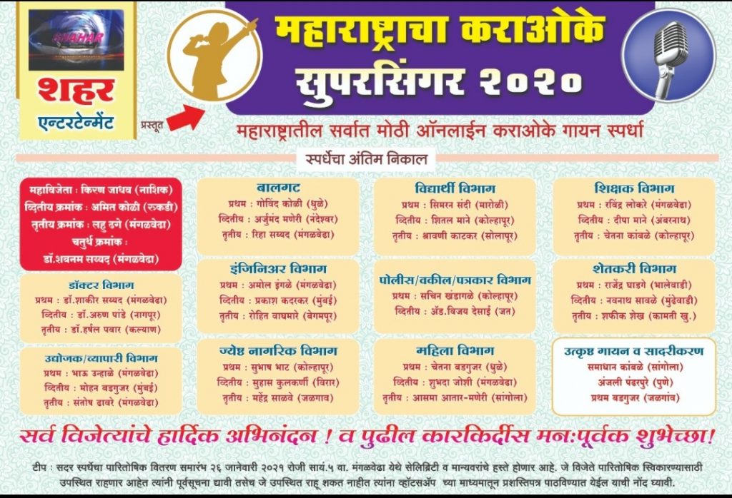 यामध्ये महिला विभागातील स्पर्धक सौ. चेतनाताई ह्यांनी तीनही फेरीत भरपूर प्रतिसाद मिळवत अंतिम फेरीत पोहोचल्या.आपल्या सुमधुर आणि मंत्रमुग्ध करणाऱ्या आवाजामुळे या स्पर्धेत त्यांनी आपली एक आगळी वेगळी छाप सोडत प्रथम क्रमांकाने यश संपादन केले.