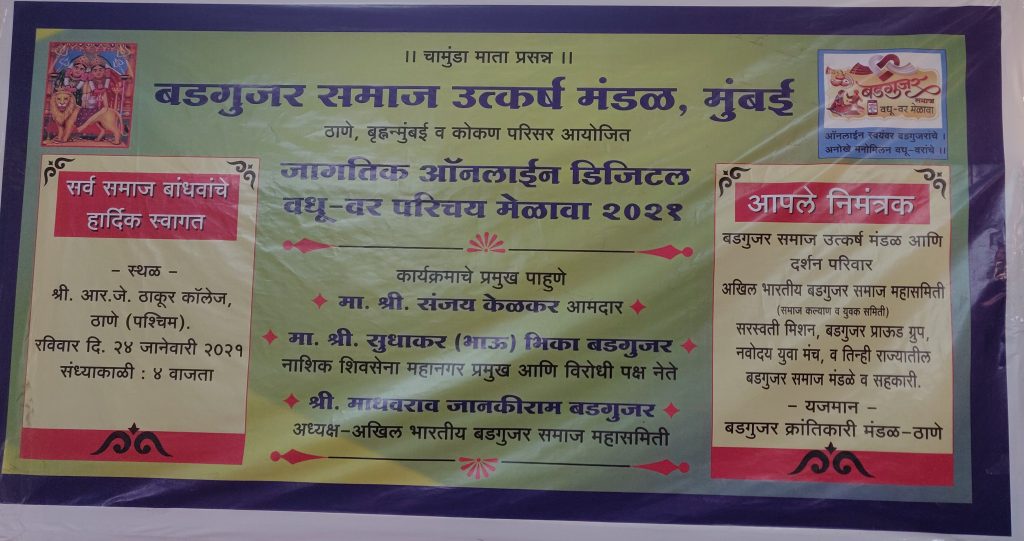 1. क्षत्रिय बडगुजर समाज उत्कर्ष मंडळ मुंबईचे अध्यक्ष पदाधिकारी व जागतिक ऑनलाईन डिजिटल वधू वर मेळाव्यासाठी ज्यांनी परीश्रम घेतले त्या सर्व कॉम्पुटर क्षेत्रातील समाजबांधव तसेच आयोजकांचे मनःपूर्वक हार्दिक अभिनंदन ! खुप छान ! Congratulations