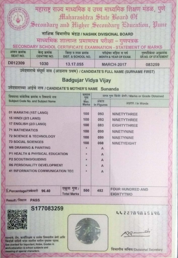कु. विद्या ही हातगाडीवर भाजीविक्रेते श्री. विजय लक्ष्मण बडगुजर यांची कन्या असून. आई-वडिलांच्या अभिमान उंचावेल अशी दैदिप्यमान कामगिरी तिने करून दाखवली आहे. कु. विद्या हिच्या आईवडिलांचे सर्वत्र कौतुक होत आहे.