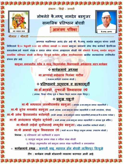 दि 20 फेब्रुवारी 2021 रोजी कै. नथ्थू नामदेव बडगुजर यांच्या जयंती निमित्ताने बोराडी येथील छत्रपती शाहू महाराज हॉल या ठिकाणी सोहळ्याचे आयोजन करण्यात आले आहे.