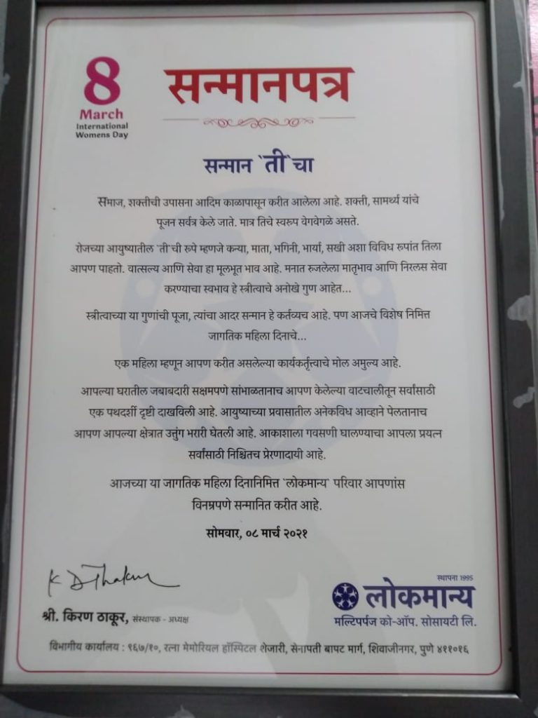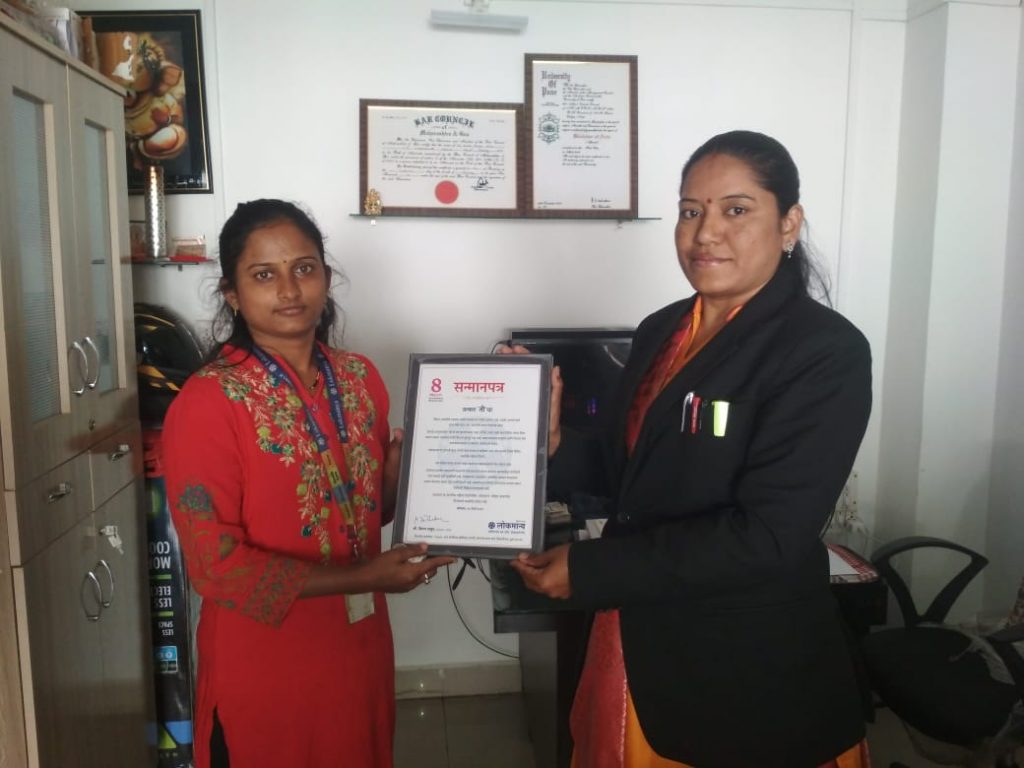 दि. ८/३/२०२१ रोजी महिला दिनानिमित्त लोकमान्य मल्टीपर्पज को. ऑ. बँक शाखा भोसरी पुणे या बँकेचे मॅनेजर यांचे हस्ते भोसरी पुणे येथील ऍड वैशली भुषण बडगुजर यांनी गेल्या 15 वर्षात महिलांना न्याय मिळवून देण्यासाठी त्यांनी केलेल्या सामाजिक व कायदेशीर कार्याबद्दल त्यांचा सन्मानपत्र देऊन सत्कार करण्यात आला.