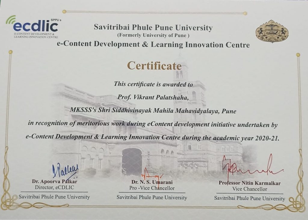 कोरोना संकट काळात विद्यापीठाने विध्यार्थ्यासाठी E-CANTENT विकसीत करण्यासाठी १० महाविद्यालयाची निवड केली त्यामध्ये श्री. सिद्धी विनायक महिला महाविद्यालयाचा समावेश होता. यांत महाविद्यालयाने उल्लेखनीय कामगिरी बजावली यात श्री. विक्रांत पालटशा यांनी समन्वयक म्हणून काम पाहिले.