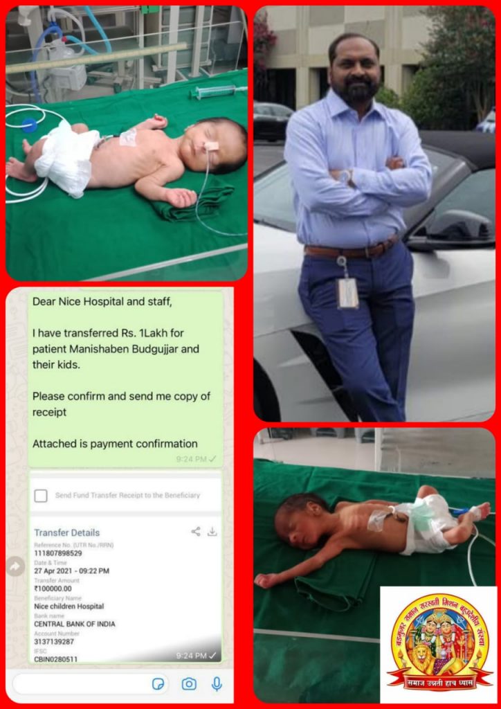 सुरत येथील समाज भगिनी श्रीमती. मनीषा जगदीश बडगुजर. यांना दि.- 12/04/2021 हया दिवशी जुळवे मुल जन्माला आले. पण जुळवे मुल हे साडेसहा महिन्यतच जन्माला आल्यामुळे त्यांची वाढ पूर्ण झाली नाही त्यामुळे दोन्ही मुलांना काचेच्या पेटीत ठेवलेले आहे. दोघांच्या काचेच्या पेटीचे दिवसाचे १४००० रुपये लागत आहे अंदाजे खर्च रु.२,३२,५०० लागणार आहे. या संदर्भात बडगुजर युवा संघटन चे सदस्य धर्मेश बडगुजर व लहान मुलांचे काका दिनेश बडगुजर यांनी ठाणे येथील सरस्वती मिशन प्रतिनिधी ज्ञानेश्वर बडगुजर यांना फोन करून संपूर्ण माहिती दिली.