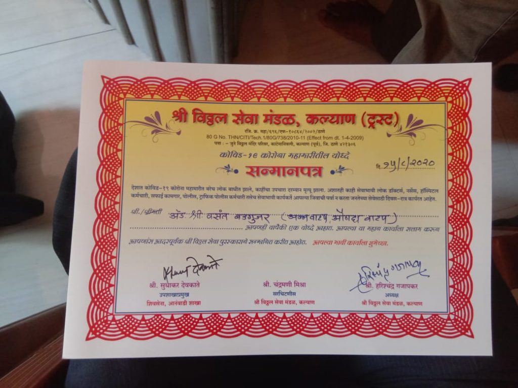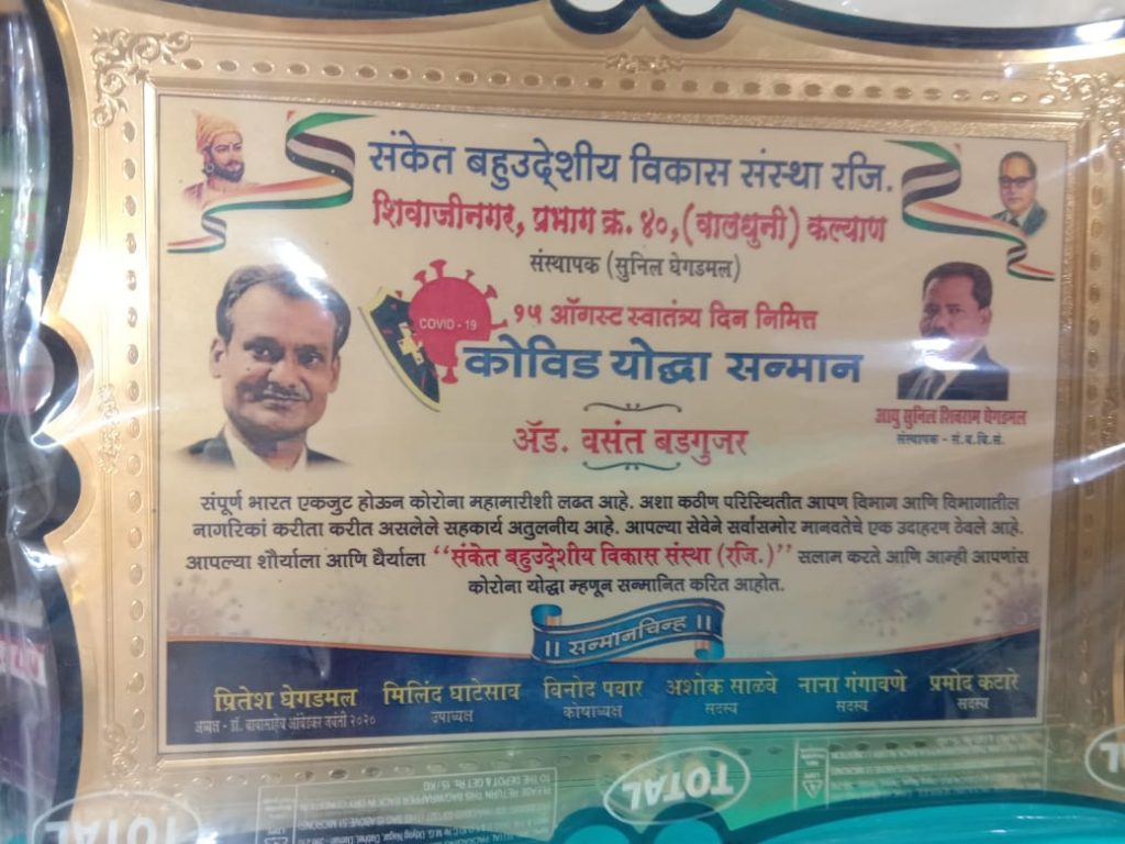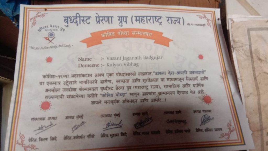 त्यांनी आपण सर्व जण बघत आहोत की कोरोनाची दुसरी लाट ही पहिल्या लाटे पेक्षा खुप भयकर होती. महामारीने व लॉक डाउन मुळे बरेच व्यक्ति ह्या आर्थिक अडचणीत होते. अशा काही परिवारामध्ये घरातले बरेच जीवनावश्यक वस्तु ची आवश्यकता भासत होती. अशा परिवाराची माहिती मिळवून व आर्थिक दृष्ट्या दुर्बल असलेले व त्या परिवारामध्ये कोरोना पीडित आर्थिक दुर्बल असलेल्या १०० परिवारांना किट व औषधी चे वाटप करुण मदत केली. अशा कोविड १९ च्या महा संकटात आपण एका योद्धा सारखे लढलात आपला देश आपली जबाबदारी या एकमात्र उद्देशाने नागरिकांचे आरोग्य स्वच्छता या माध्यमातून निस्वार्थ आणि अनमोल जनसेवा केल्याबद्दल राज्यव्यापी संघटनेच्या वतीने बुद्धिस्ट प्रेरणा गृप ( महाराष्ट्र राज्य) कोविड योद्धा, संकेत बहुउद्देशीय विकास संस्था शिवाजी नगर कल्याण, व श्री. विट्ठल सेवा मंडळ कल्याण ट्रस्ट या संस्था मार्फत कोरोना योद्धा सन्मानपत्र देऊन गौवरण्यात आले.