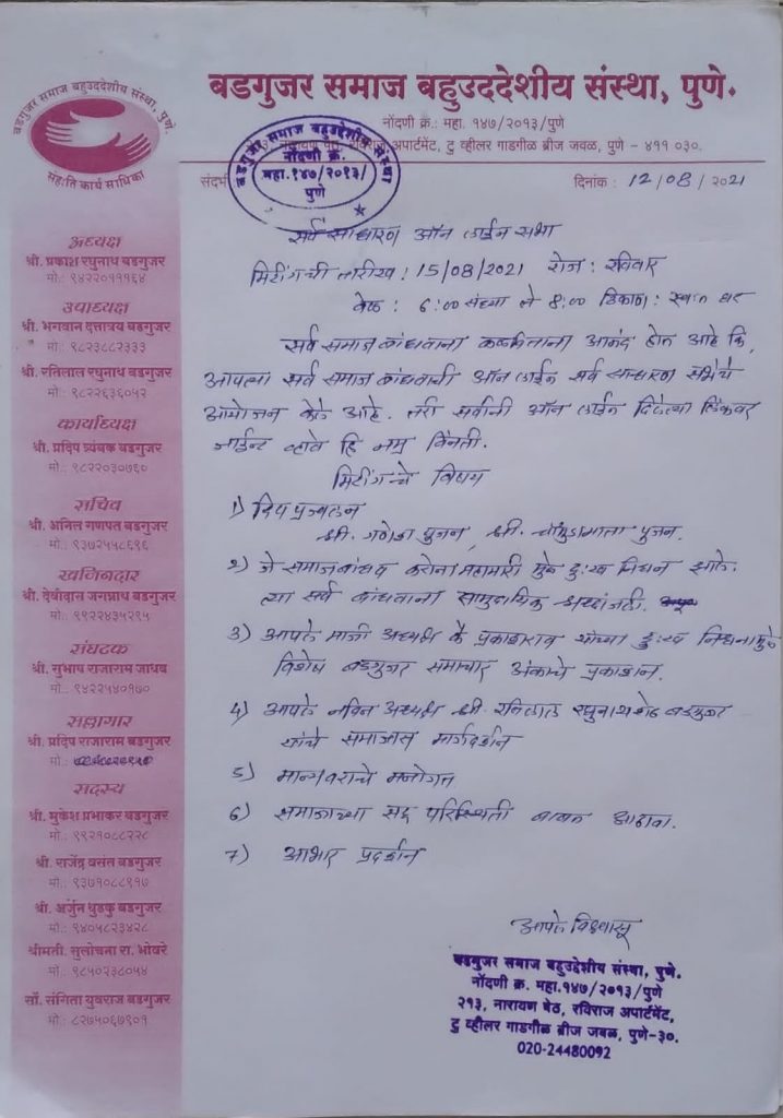 पुणे शहर बडगुजर समाजबांधवांसाठी आयोजित ऑनलाईन समाज मेळावा (सभा)
