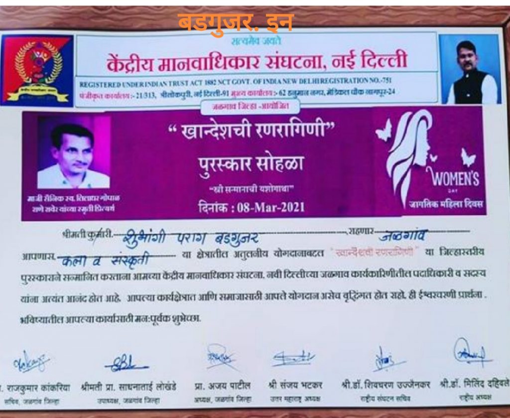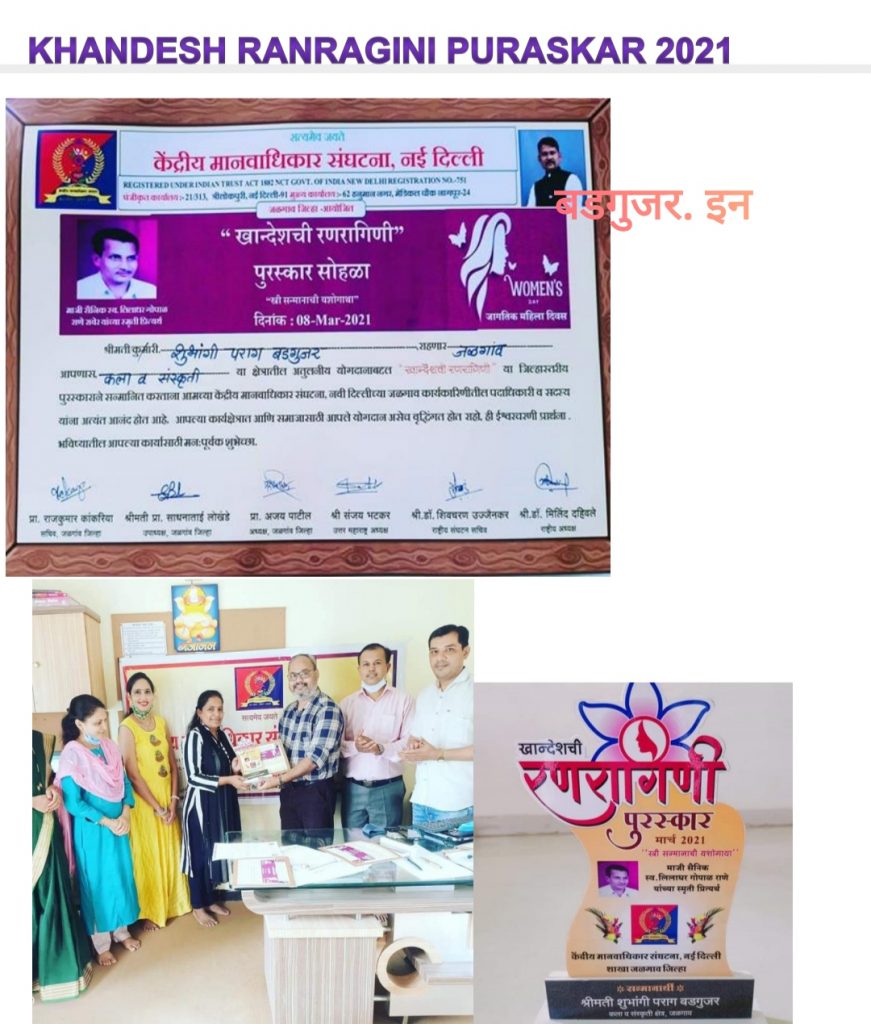 जामनेर येथील ह. मु. जळगाव सौ. शुभांगी पराग बडगुजर यांचे शिक्षण हे एम. ए. बी. एड. इंग्लिश या विषयातून झाले आहे. त्यांनी अखिल भारतीय गधंर्व महाविद्यालयातील संगीत विशारद (गायन शास्त्रीय) पूर्ण केले आहे, तसेच संगीत भास्कर, संगीत प्रभाकर, हेही पूर्ण केलेले आहे. सौ. शुभांगी बडगुजर हे जी. एच. रायसोनी पब्लिक स्कूल जळगाव येथे टीचर म्हणून कार्यरत आहेत.ते कल्चर इव्हेंट मध्ये जाणे जाणे त्यांना आवडते. त्यांना वाचन, लेखन, कविता, चारोळी याचीही आवड आहे. आकाशवाणी जळगाव येथे युवावानी, माहेर, ह्या दोन प्रसारण विभागात त्यांनी कामही केले आहे. (ऑल इंडिया रेडिओ प्रसारण भारतीय येथे वानी प्रमाणपत्र अभ्यासक्रम अँड ग्रॅज्युएशन अनाउन्समेंट आकाशवाणी जळगाव येथे केले आहे) रेडिओ सिटी ९१.१ एफ. एम. द्वारे “मिसेस आर जे” म्हणून सन्मानित, अनेक सांस्कृतिक कार्यक्रमांमध्ये परीक्षक म्हणून काम केले आणि कार्यक्रमां मध्ये अँकरिंग आणि सिंगिंग परफॉर्मन्स, एन. एम. यू. जळगाव द्वारे “युवा रंग” मध्ये परीक्षक म्हणून नियुक्ती, “प्रतिभा संगम अखिल” मध्ये निवड व सहभाग, नांदेड येथे भारतीय मराठी साहित्य संमेलन दिनांक २२ ते २४सप्टेंबर २००२, जाणता राजा प्रतिष्ठान जळगाव तर्फे “हिरकणी” पुरस्कार, सकाळ तर्फे “मधुरांगण तेजस्विनी”पुरस्कार साठी नामांकित, ऑल इंडिया रेडिओ जळगाव येथे प्रासंगिक उद्दगोषक, कला आणि संस्कृती क्षेत्रात उल्लेखनीय कामगिरी केल्याबद्दल मानवाधिकार संघटना नवी दिल्ली द्वारे अलीकडेच “खान्देश रणरागिणी” २०२१ मध्ये सन्मानित करण्यात आले, राज्यस्तरीय सांस्कृतिक कार्यक्रम उत्कर्ष २०२० साठी परीक्षक, के. बी. सी. द्वारे आयोजित केलेल्या “युवा रंग’ २०१८ – २०१९ शास्त्रीय गायन स्पर्धेसाठी परीक्षक (उत्तर महाराष्ट्र विद्यापीठ) कुसुंबा, क्रीडा व युवक सेवा संचालनालय म. रा. पुणे अंतर्गत जिल्हा क्रीडा अधिकारी कार्यालय जळगाव मार्फत आयोजित युवा महोत्सव २०२२ मध्ये दि. ३ व ४ जानेवारी मध्ये कोविड १९ व्या पार्श्वभूमीवर ऑनलाईन पद्धतीने लोकगीत गायन स्पर्धेचे परीक्षण करण्याची संधी मिळाली, नवोदय बडगुजर समाज जागृती व उन्नती महा सेवासंघ फागणे आयोजित “बडगुजर समाज महिला गुणगौरव सोहळा” गर्व आम्हा बडगुजरचा २०१७ कार्यक्रमात सौ. शुभांगी पराग बडगुजर यांना संगीत व सांस्कृतिक क्षेत्रात उल्लेखनीय व कौतुकास्पद कार्याबद्दल सन्मानित करण्यात आले. अश्या सौ. शुभांगी पराग बडगुजर यांना मानाचा मुजरा व अखिल भारतीय युवक समिती, बडगुजर. इन, प्राऊड ग्रुप, बडगुजर युवा संगठन सुरत, 👣जय चांमुडा माता हिरकणी ग्रुप👣 यांच्या कडून भावी वाटचालीस शुभेच्छा!