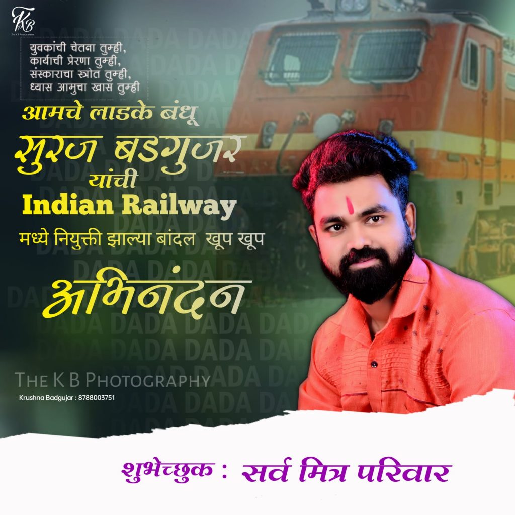 धरणगाव येथील सुरज भगवान बडगुजर यांची रेल्वे मध्ये नियुक्ती झाल्याबद्दल त्यांचे खूप खूप अभिनंदन व पुढील वाटचालीसाठी शुभेच्छा