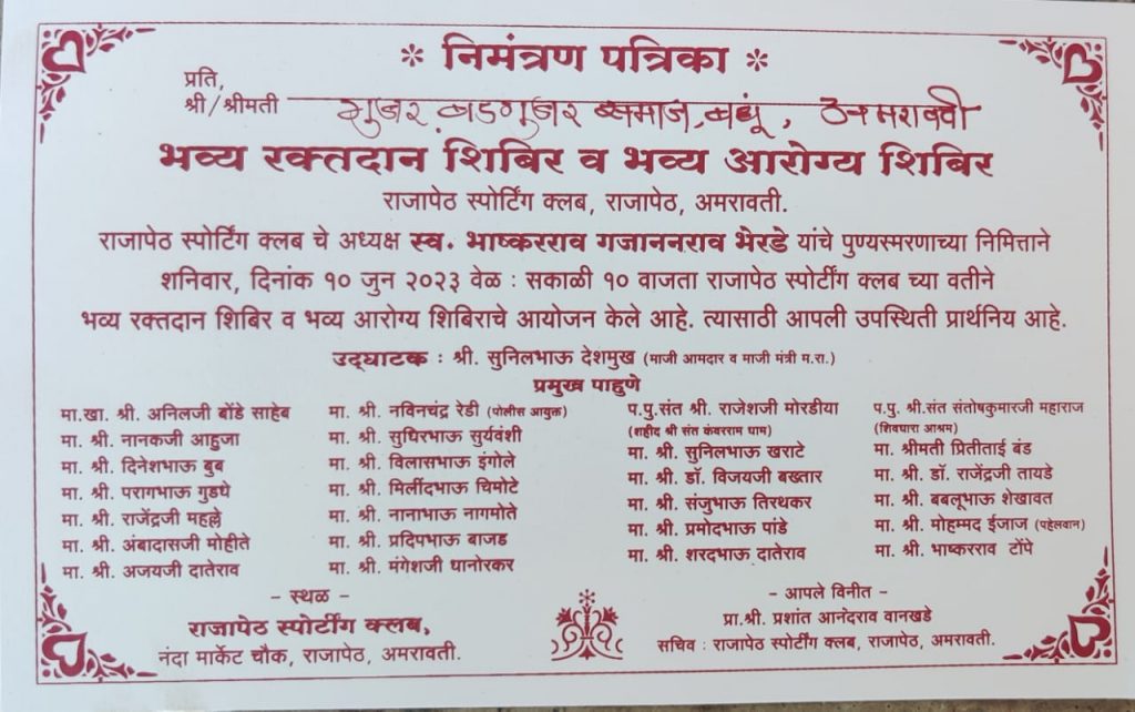 भव्य रक्तदान शिबिर व निशुल्क भव्य रोगनिदान शिबिराचे आयोजन करण्यात आले आहे.