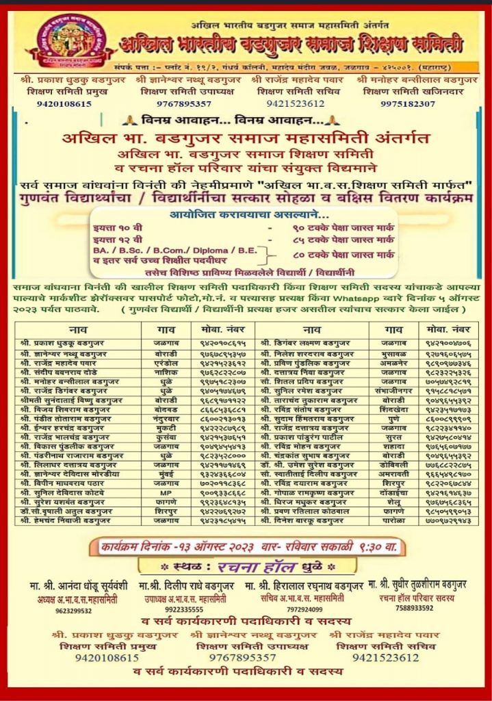 अखिल भारतीय बडगुजर समाज महासमिती अंतर्गत शिक्षण समिती व रचना हॉल परिवार यांच्या संयुक्त विद्यमाने गुणवंत विद्यार्थी गुणगौरव सोहळ्याचे आयोजन – श्री. पी. डी. बडगुजर सर, अ. भा. ब. स. शिक्षण समिती प्रमुख July 25, 2023 Lokesh समाजिक कार्यक्रम (Functions) 1 Share this:WhatsApp