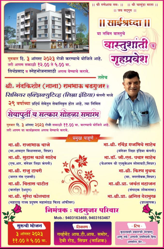 वंजारी भोकर ह. मु. सिन्नर येथील श्री. नंदकिशोर रामभाऊ बडगुजर हे दि. ३१ जुलै २०२३ रोजी , आपल्या २९ वर्षांच्या प्रदीर्घ सेवेतुन सेवा निवृत्त झाले. ते लिग्रा इंडिया कंपनी तुन सिनियर एक्झिक्युटिव्ह या पदावरून निवृत्त. त्यांचा सेवापुर्ती, सत्कार सोहळा व वास्तुशांती गृहप्रवेश समारंभ वार गुरुवार दि. ३ ऑगस्ट २०२३ रोजी आयोजन केला आहे. गव्हर्नमेंट आय. टी. आय. समोर देवी रोड, सिन्नर (नाशिक).