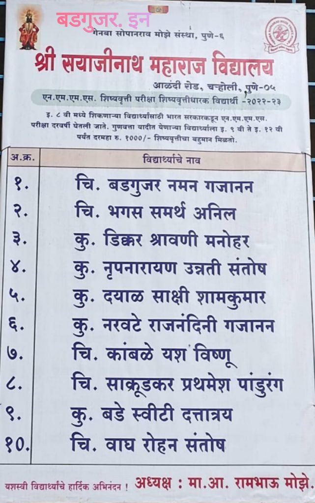 पिंपळकोठा ह. मु. आळंदी येथील श्री. गजानन हिरालाल बडगुजर यांचा चि. नमन गजानन बडगुजर हे श्री सयाजीनाथ महाराज विद्यालयविद्यालय आळंदी चऱ्होली रोड पुणे येथे इयत्ता ८ वी च्या कक्षेत एन. एम. एम. एस. (National Means Merit Scholarship) ची परीक्षा देऊन महाराष्ट्रात १३७ तर विद्यालयातून प्रथम क्रमांक पटकावून शिष्यवृत्ती ही दरमहा १००० रुपये मिळणार आहेत.