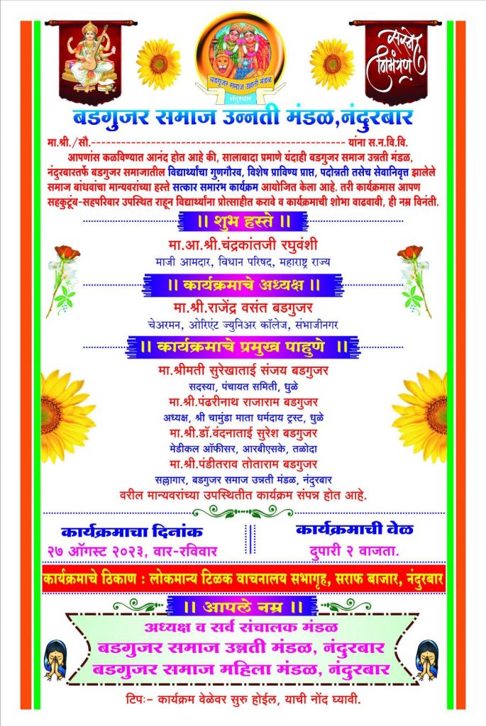 बडगुजर समाज उन्नती मंडळ नंदुरबार तर्फे बडगुजर समाजातील विद्यार्थी व विद्यार्थिनी गुण गौरव, विशेष प्राविण्य,प्राप्त, पदोन्नती, व सेवानिवृत्त झालेले सर्व समाज बांधव यांचा मान्यवरांच्या हस्ते सत्कार समारंभ कार्यक्रम आयोजित केला आहे तरी आपण सहकुटुंब सहपरिवार उपस्थित राहून विद्यार्थ्यांना प्रोत्साहित करावे व कार्यक्रमाची शोभा ही वाढवावी. कार्यक्रम वार रविवार दिनांक २७ ऑगस्ट २०२३ रोजी, दुपारी दोन वाजता आयोजित केला आहे. कार्यक्रमाचे ठिकाण :- लोकमान्य टिळक वाचनालय सभागृह सराफ बाजार नंदुरबार