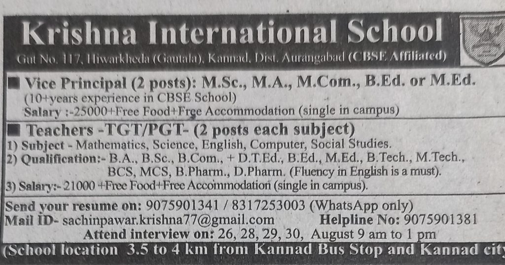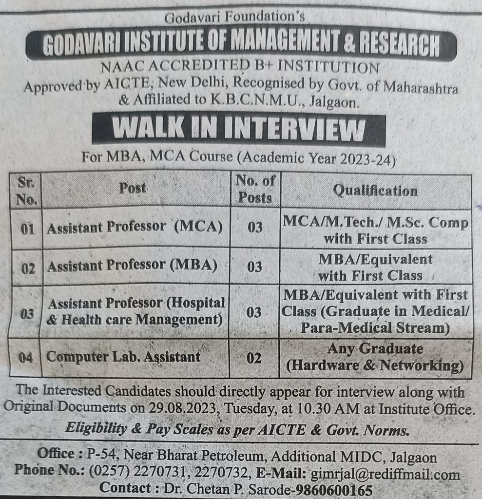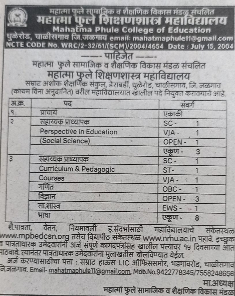 3) पदाचे नाव – सहायक प्राध्यापक / Assistant Professor