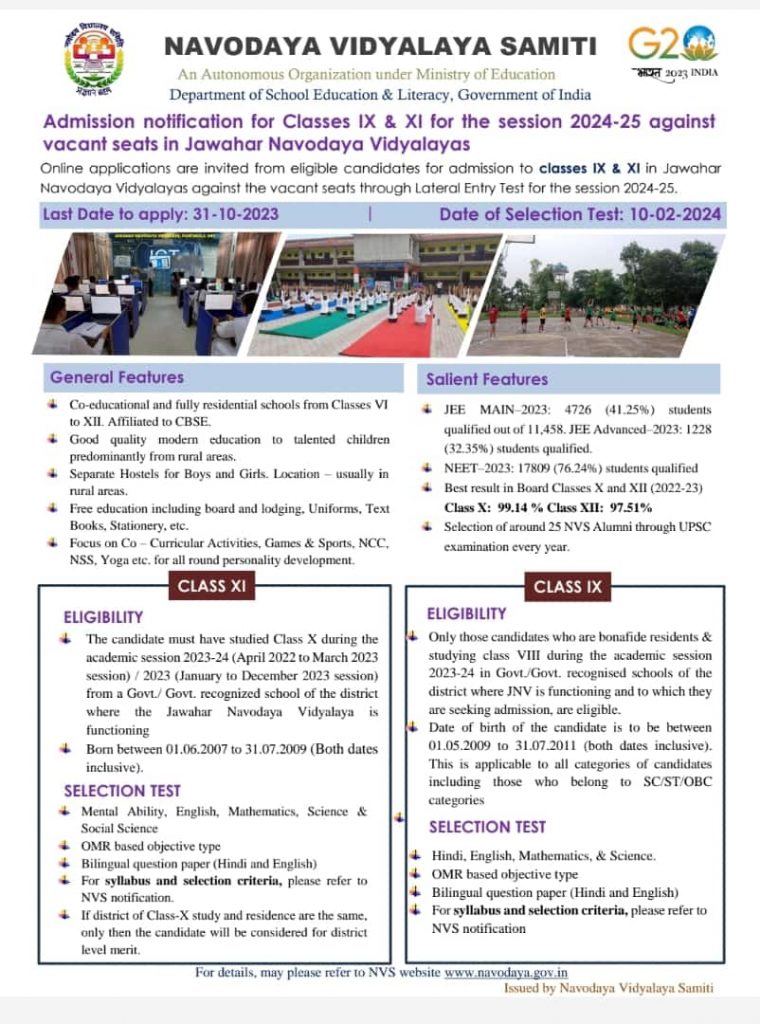 नवोदय विद्यालय समिती अंतर्गत ९ वी व ११ वी वर्ग साठी ऍडमिशन सन २०२४-२५ साठी जवाहरलाल नवोदय विद्यालय चे ऑनलाईन फॉर्म हे दि. ३१ ऑक्टोबर २०२३ भरावयाचे आहेत.