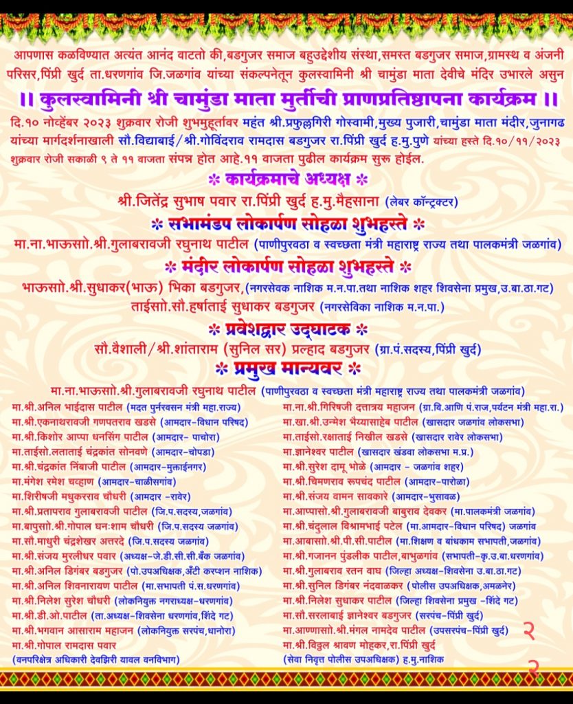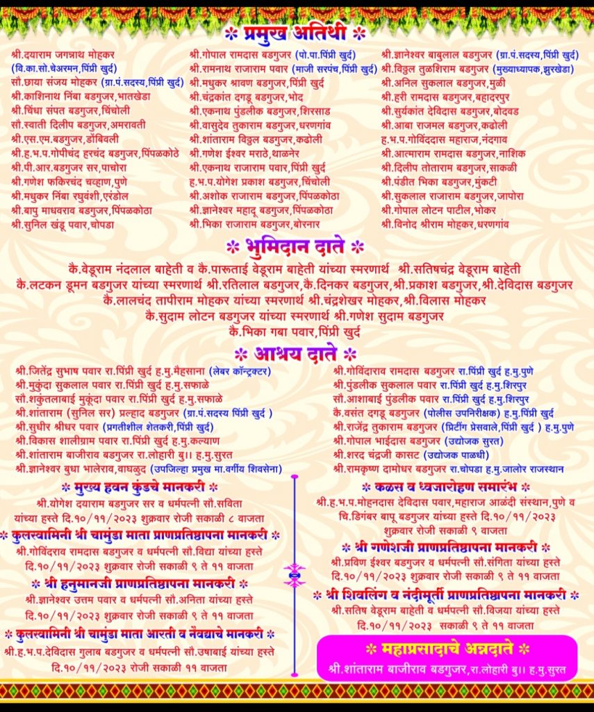 पिंप्री खुर्द येथे श्री चामुंडा माता मूर्ती प्राणप्रतिष्ठा सोहळा दिनांक १० नोव्हेंबर २०२३ शुक्रवार रोजी महंत श्री. प्रफुल्ल गिरी गोस्वामी मुख्य पुजारी चामुंडा माता मंदिर जुनागड यांच्या मार्गदर्शनाखाली श्री गोविंद रामदास बडगुजर व सौ. विद्या बाई गोविंद बडगुजर राहणार पिंप्री खुर्द हल्ली मुक्काम पुणे यांच्या हस्ते संपन्न होणार आहे .