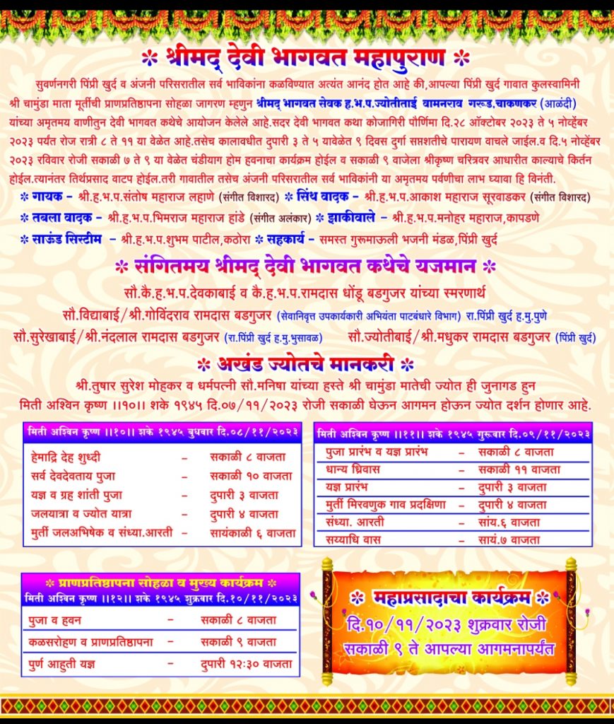 यजमान श्री. गोविंदराव रामदास बडगुजर सेवानिवृत्त उपकार्यकरी अभियंता, पाटबंधारे विभाग रा. पिंप्री ह. मु. पुणे यांच्या वतीने श्रीमद देवी भागवत महापुराण हे श्रीमद भागवत सेवक ह.भ.प. ज्योतीबाई वामनराव गरुड चाकणकर, आळंदी यांच्या अमृतमय वाणीतुन देवी भागवत कथेचे आयोजन हे कोजागिरी पौर्णिमा दि. २८ ऑक्टोबर ३०२३ ते दि.५ नोव्हेंबर २०२३ पर्यत रोज रात्री ८ते ११ या वेळेत असेल.
