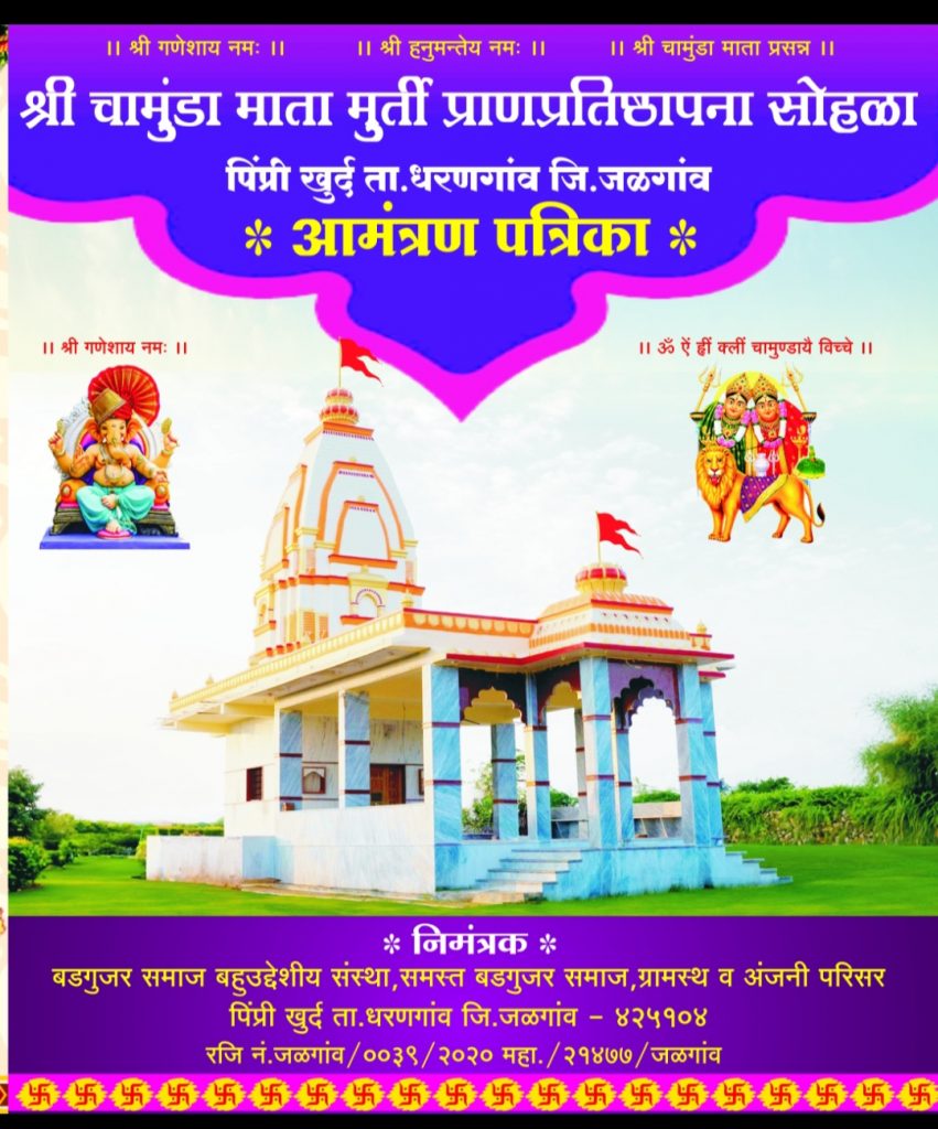 आपणास कळविण्यात आनंद होतो , की, पिंप्री खुर्द येथील श्री कुलस्वामिनी चामुंडा माता मंदिराचा प्राणप्रतिष्ठा सोहळा हा भव्य दिव्य स्वरूपात संपन्न होणार आहे. आपण आवर्जून कुलस्वामिनीच्या प्राणप्रतिष्ठा सोहळ्यासाठी उपस्थित राहुन शोभा वाढवावी ही नम्र विनंती.